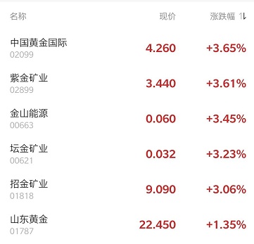截至发稿,中国黄金国际(02099)涨3.65%,报4.26港元;紫金矿业(02899)涨3.61%,报3.44港元;招金矿业(01818)涨3.06%,报9.09港元;山东黄金(01787)涨1.13%,报22.4港元。
