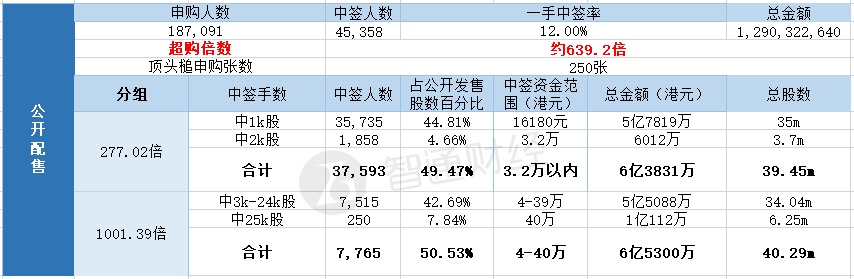 其中,公开配售申购人数187091,一手中签率12%,超购倍数约639.2倍。