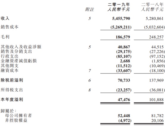 目前公司寻求与华新光电的合作也是想在产品方面做出创新,从而转战一线品牌供应链,但是恰巧碰到全球手机市场疲弱时期,加上2019年国际贸易形势问题使得一线品牌趋向保守,因此公司采纳新的定价策略抢占市场份额来守住一线品牌客户。此背景下,公司整体毛利率同比下降1.3个百分点至3.4%,公司最终实现1.87亿元毛利总额,较去年同期大幅下滑24.8%。而在费用端,除了行政开支同比下滑12.4%至8510.7万元之外,销售及分销开支、其它开支、融资成本还分别同比增长7.16%、9.96%、85.67%至2917.5万元、1151.2万元和3360.7万元,公司全年净利润录得53.4%大幅下跌至7073.3万元,刨除非控股权益部分后的跌幅仍有35.9%。