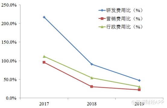 除了销售成本之外,亿航智能的费率一直是掣肘其利润的主要原因,不过近三年也有了明显改善。智通财经APP统计到,2017年至2019年,亿航智能的研发费用占比从216%降至47%,营销费用比从95.8%降至22.1%,行政费用比从111.7%降至30.3%,三项费用合计占比从2017年的424%降至2019年的99.2%。