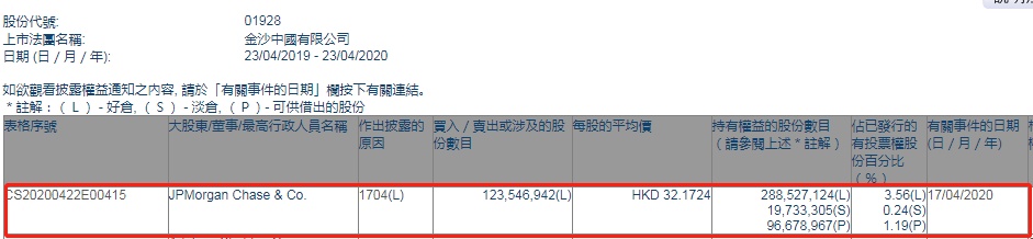 智通财经APP获悉,联交所最新资料显示,4月17日,摩根大通减持金沙中国(01928)1.23546942亿股,每股作价32.1724港元,总金额约为39.75亿港元。减持后最新持股数目约为2.89亿股,最新持股比例为3.56%。