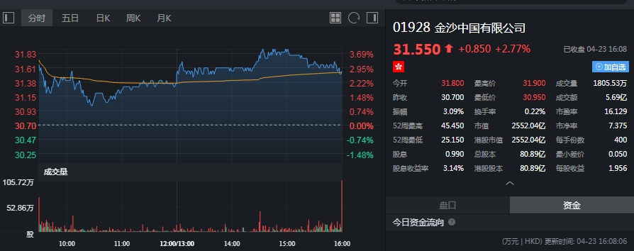 截至今日收盘,金沙中国涨2.77%,报31.55港元。