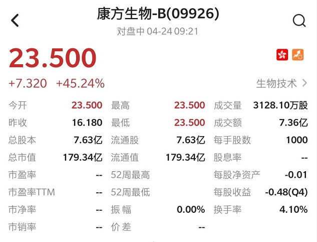 智通财经APP获悉,康方生物-B(09926)首日挂牌,公告显示,公司发行1.6亿股,每股定价16.18港元,每手1000股,所得款项净额约24.37亿港元。截至发稿,涨45.24%,报23.5港元,成交额7.36亿港元。