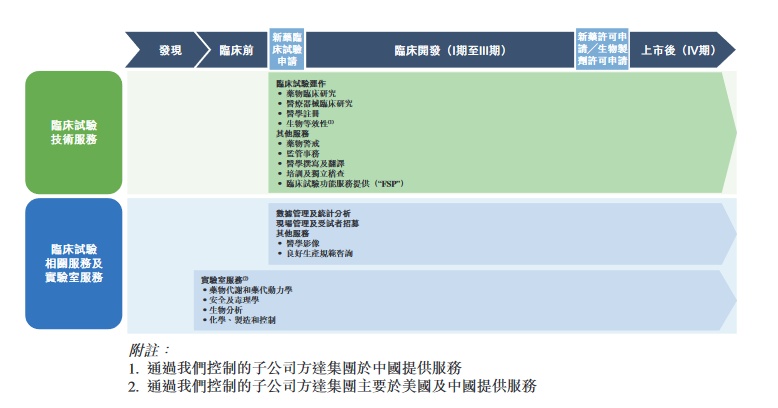 公司提供全面及综合:临床试验技术服务及临床相关及实验室服务,范围主要涵盖药物和医疗器械的临床前研究至上市后研究。公司的临床试验技术服务包含临床试验运作服务以及与临床试验直接相关的配套服务,包括医学撰写、翻译及注册服务、以及药物警戒服务。公司的临床相关及实验室服务包括数据管理及统计分析、临床试验现场管理及患者招募,以及公司的子公司方达控股提供的实验室服务。