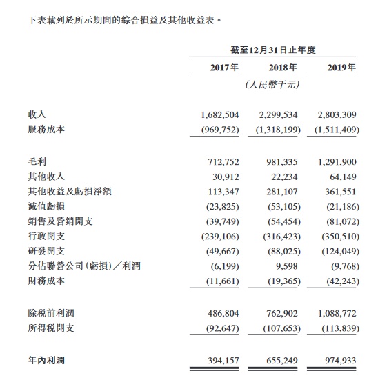 于业绩记录期,公司增长强劲。公司的总收入由2017年的人民币16.83亿元增至2018年的人民币23亿元,并进一步增至2019年的人民币28.03亿元,复合年增长率为29.1%。公司的净利润由2017年的人民币3.94亿元增至2018年的人民币6.55亿元,并进一步增至2019年的人民币9.75亿元,复合年增长率为57.3%。