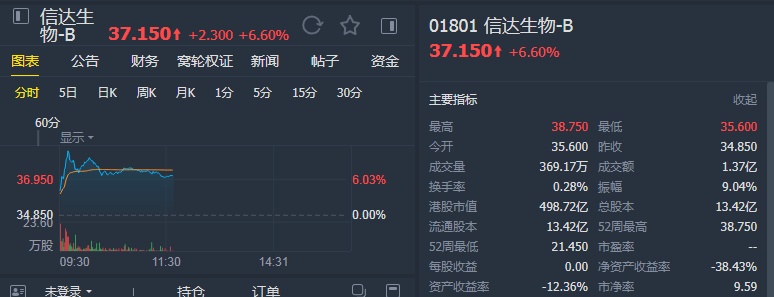 瑞信上调信达生物股份目标价,由38港元升至41.5港元,评级维持“跑赢大市”,并上调集团今明两年收入预测分别33%及15%,以反映今年首季销售较预期好。