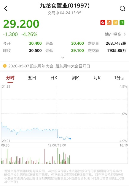 智通财经APP获悉,九龙仓置业(01997)午间公告,截至2020年6月30日止六个月业绩可能录得亏损,去年同期净利润69.89亿港元。截至发稿,九龙仓置业跌4.26%,报29.2港元,成交额7982.57万港元。