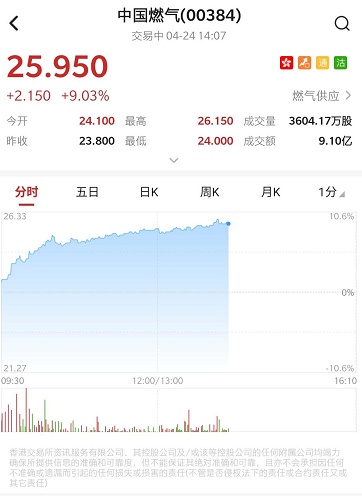 智通财经APP获悉,大和发布报告称,虽然农村燃气项目补贴的相关威胁仍在,但相信中国燃气(00384)管理层目标为在2022/2023年度的纯利达140亿至150亿元,该行上调对集团股份评级,由“持有”升至“跑赢大市”,目标价由23.5港元上调至26港元。该股午后涨幅扩大,截至发稿,涨9.24%,报26港元,成交额9.06亿港元。