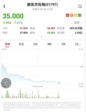 智通财经APP获悉,新东方在线(01797)近期港股通持仓比例持续下滑,盘中股价高位回吐,截至14时30分,跌7.41%,报价35港元,成交额2.2亿。