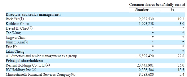 主要股东中,Recruit Holdings Co., Ltd.为公司第一大股东,持股23,443,981股,其持股数目较去年同期没有变化,持股比例由37.9%下降至35%。