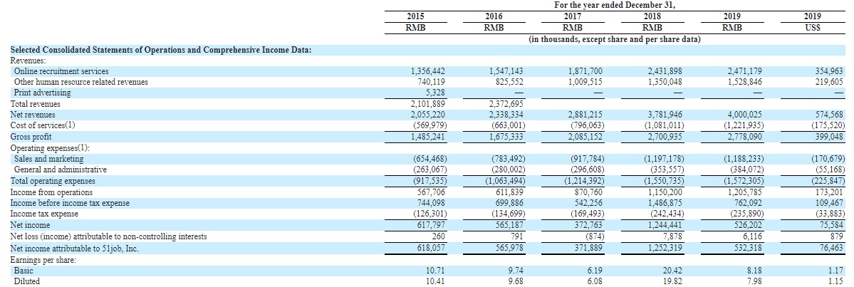 2019年,该公司营收为40亿元人民币(合约5.75亿美元),同比增长5.8%;其中,线上招聘服务营收同比增长1.6%,其它人力资源相关营收同比增长13.2%。