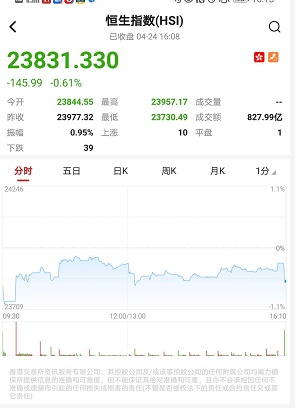 智通财经APP获悉,恒指早盘低开132.77点或0.55%,报23844.55点。截至收盘,恒生指数跌145.99点或0.61%,报23831.33点,全日成交额达827.99亿。国企指数跌0.49%,报9656.19点,红筹指数跌0.7%,报3700.59点。