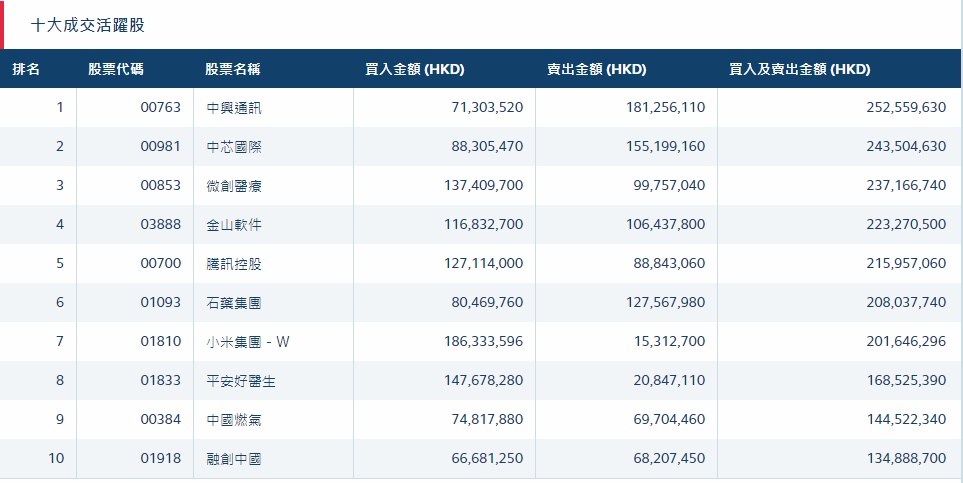 港股通(沪)十大活跃成交股