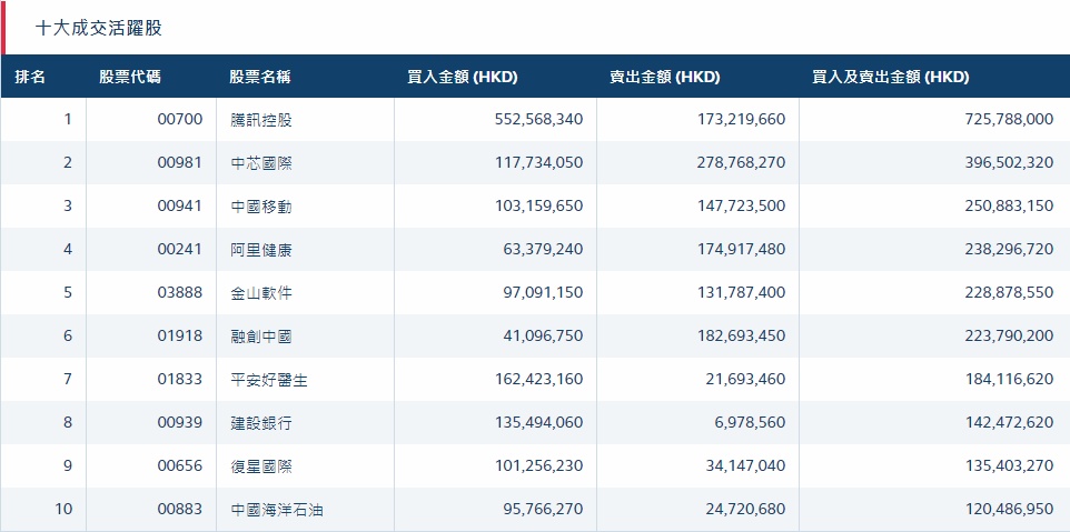 此外,建设银行(00939)、中海油(00883)、复星国际(00656)分别获净买入1.28亿、7104万、6710万港元。而中芯国际(00981)、阿里健康(00241)、中兴通讯(00763)分别遭净卖出2.27亿、1.11亿、1.09亿港元。