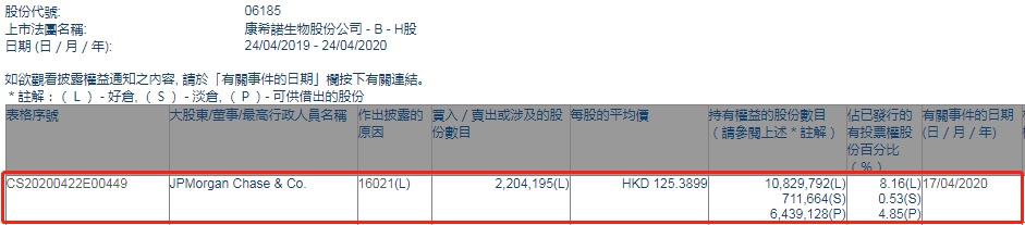 智通财经APP获悉,联交所最新资料显示,4月17日,摩根大通增持康希诺生物(06185)220.4195万股,每股作价125.3899港元,总金额约为2.76亿港元。增持后最新持股数目约为1082.98万股,最新持股比例为8.16%。