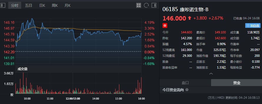 截至今日收盘,康希诺生物涨2.67%,报146港元。