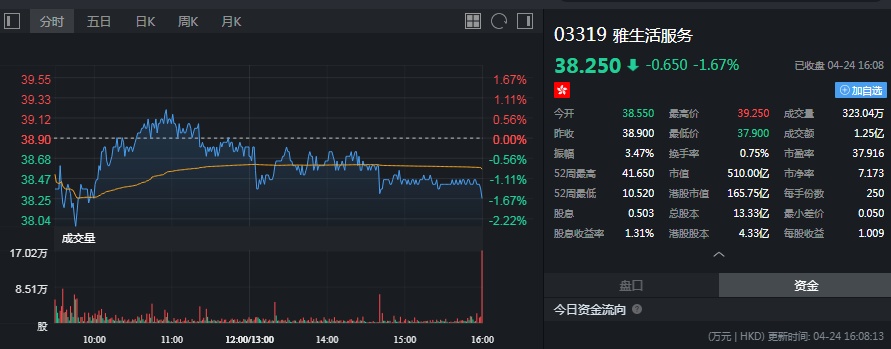 截至今日收盘,雅生活服务跌1.67%,报38.25港元。