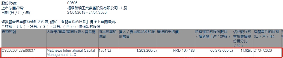 智通财经APP获悉,联交所最新资料显示,4月21日,Matthews International Capital减持福耀玻璃(03606)120.32万股,每股作价16.4183港元,总金额约为1975.45万港元。减持后最新持股数目约为6027.20万股,最新持股比例为11.92%。