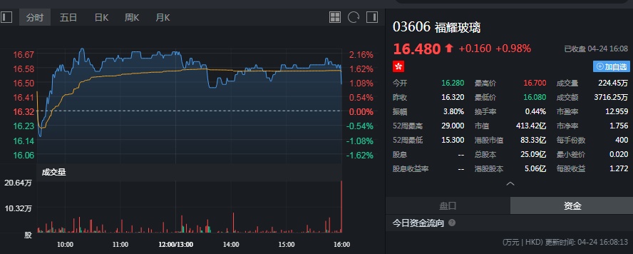 截至今日收盘,福耀玻璃(03606)涨0.98%,报16.48港元。
