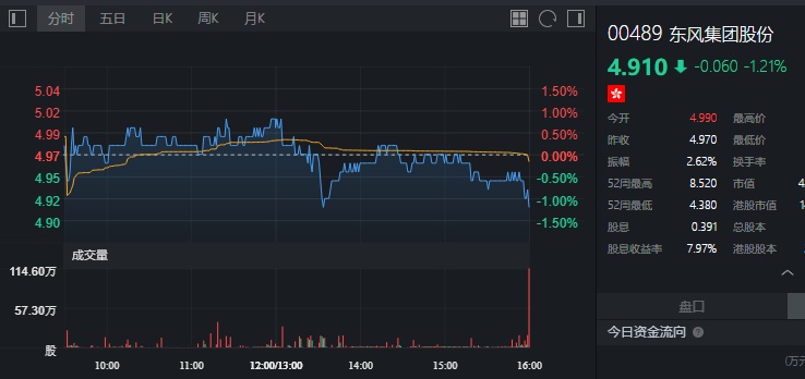 截至今日收盘,东风汽车跌1.21%,报4.91港元。