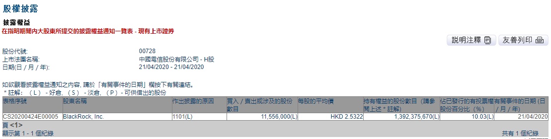 智通财经APP获悉,联交所最新资料显示,4月21日,贝莱德增持中国电信(00728)