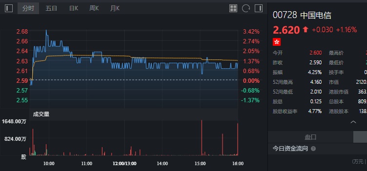 截至今日收盘,中国电信涨1.16%,报2.62港元。