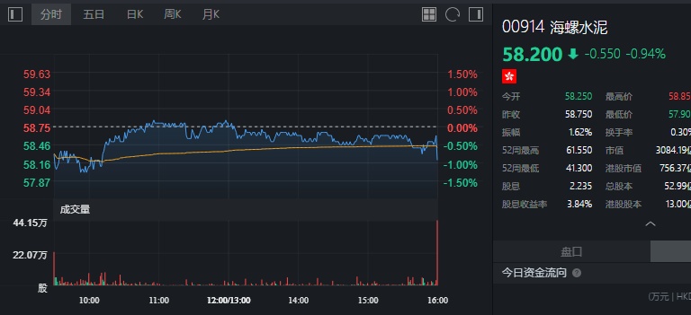 截至今日收盘,海螺水泥跌0.94%,报58.2港元。