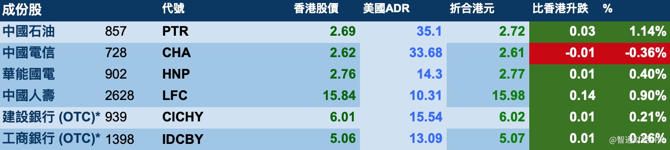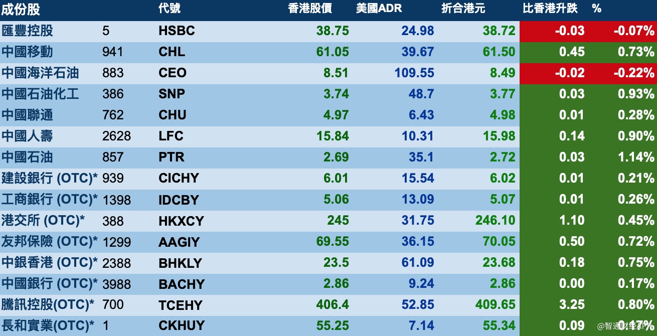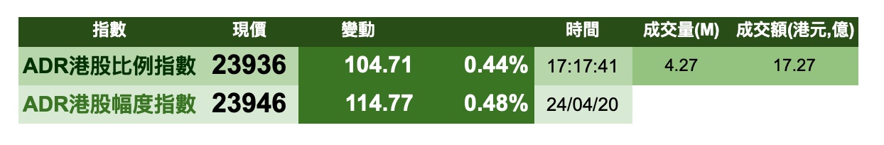 智通财经APP获悉,美股周五三大指数均涨逾1%,带动港股ADR指数全日造好,按比例计算,收报23936点,涨104.71点或0.44%。