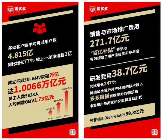 在持续创新的技术应用支撑下,2019年,拼多多人均创造GMV达1.73亿元。