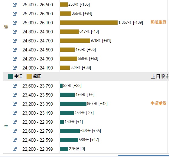 智通财经APP获悉,截至4月24日,恒指最新的牛熊街货比例36:64。摩根恒指牛熊证街货分布图中的数据显示,熊证街货重货区在25000-25199区间,该区间最新熊证数量为1857张,较上一交易日减少139张;最多新增区间在25200-25399区间,新增94张。牛证街货重货区在23200-23399区间,该区间最新牛证数量为857张,较上一交易日增加42张。最多新增在22600-22799区间,该区间最新牛证数量为646张,新增35张。