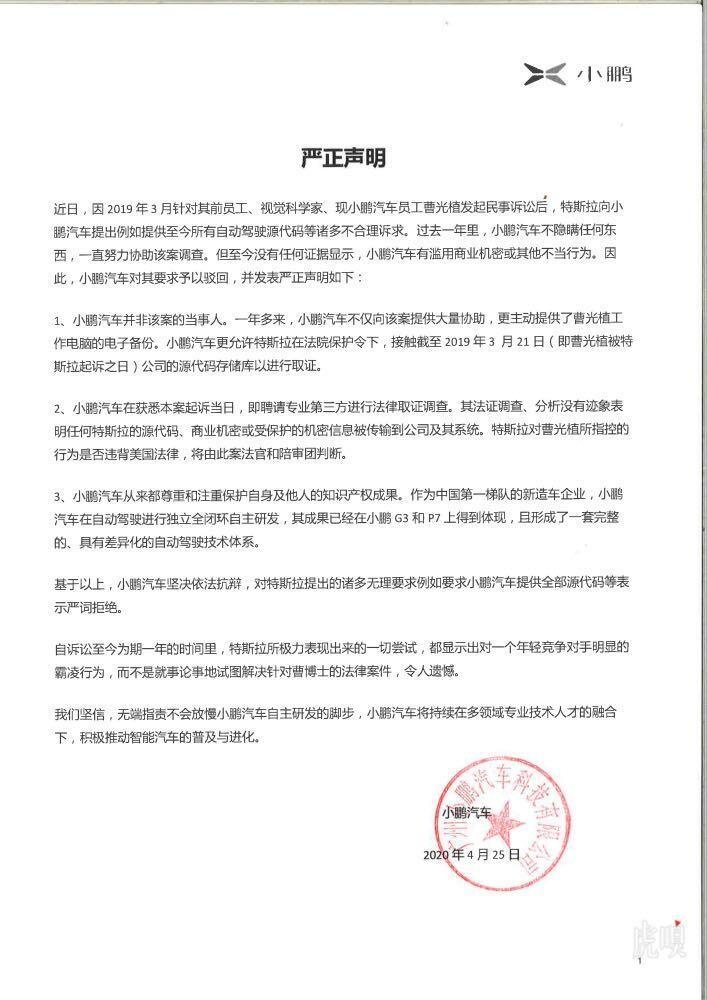 小鹏汽车称坚决依法抗辩,对特斯拉提出的诸多无理要求例如要求小鹏汽车提供全部源代码等表示严词拒绝。