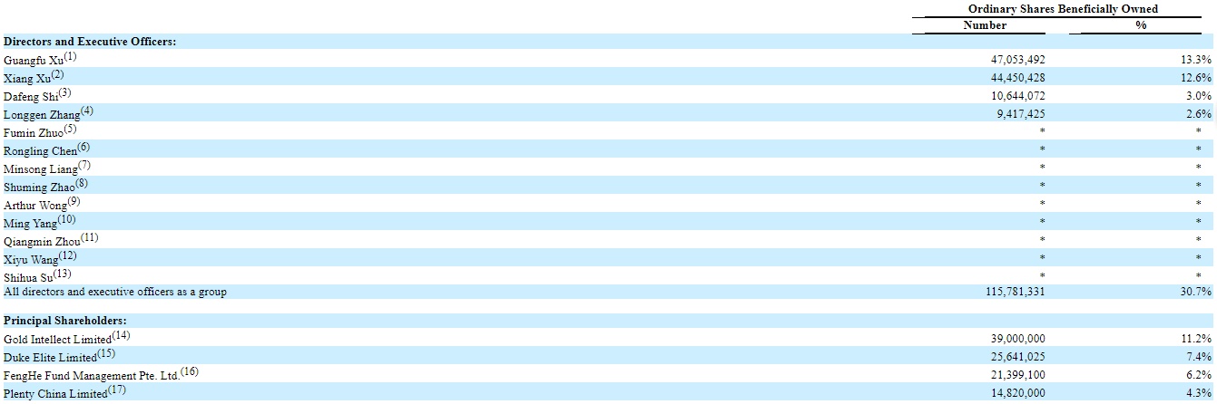 董事长徐广福持有47,053,492股普通股,占比13.3%,这其中包括:由徐广福全资拥有和控制的英属维尔京群岛公司Gold Intellect Limited持有的39,000,000股普通股;16,000股ADS,代表在期权现金行使后而持有400000股普通股;以及持有的可在年报日期之日起60天内行使的期权行权后发行的7,653,492股普通股。去年同期徐广福共持45,810,016股普通股,持股比例13.5%。