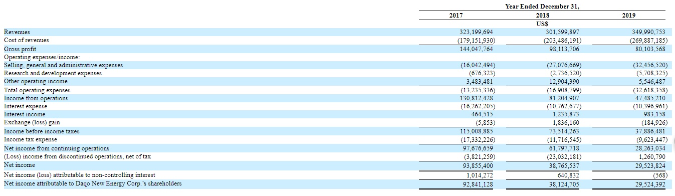 大全新能源2019年来自持续经营的收入为3.500亿美元,较2018年的3.016亿美元增长16.0%。毛利润为8010.36万美元,较去年的9811.37万美元减少18.4%。