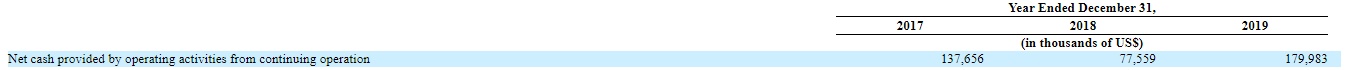 截至2019年12月31日止年度,来自持续经营业务的经营活动产生的现金净额为1.800亿美元,上年同期为7755.9万美元。
