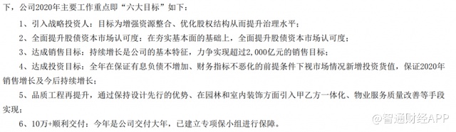 值得注意的是,2020年阳光城六大目标中,引入战略投资人和全面提升股债资本市场认可度分别放在了第一和第二的位置,销售目标和投资目标则放在了第三、第四顺位。