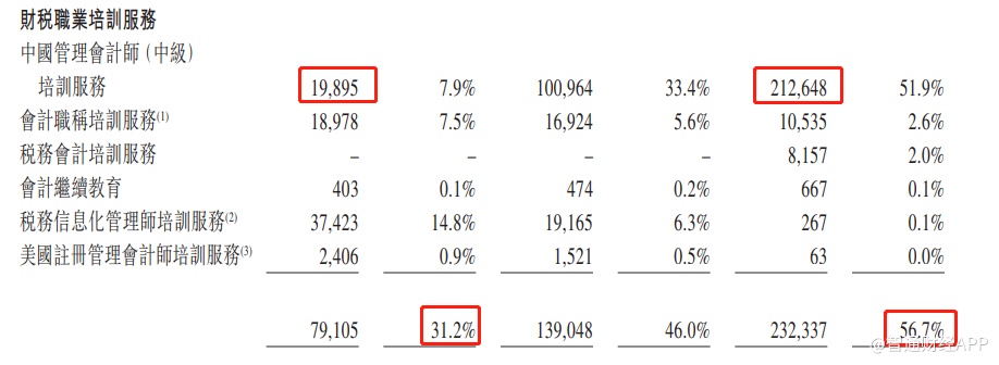 据招股书显示,中国管理会计师(中级)培训服务的收入从2017年的1989.5万增至2019年的2.13亿元,两年时间,收入翻了10倍多。随着收入的增长,该培训服务产品在收入中的比例也从2017年的7.9%提升至2019年的51.9%。