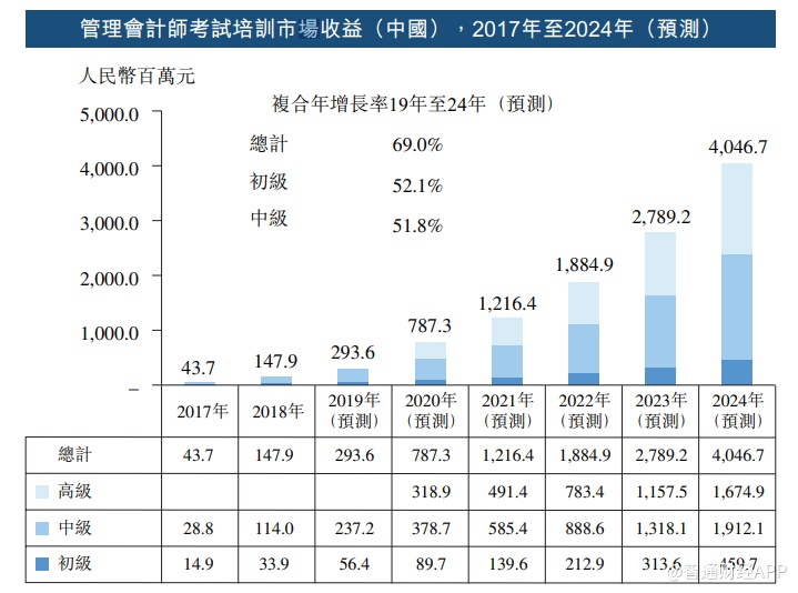 从行业角度看,无论是财税的咨询培训服务还是职业培训服务,均处于快速发展中。据弗若斯特沙利文数据显示,从2014至2019年,该两大业务的市场规模年复合增速均在30%以上。