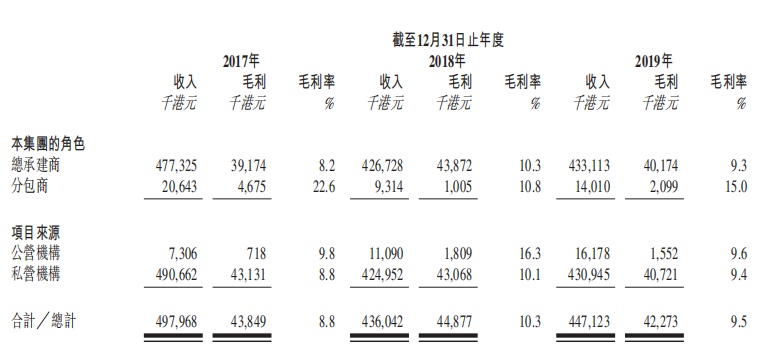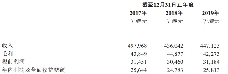 截至2019年12月31日止三个年度各年,公司毛利率分别约为8.8%、10.3%及9.5%。利润分别约为2564.4万港元、2478.3万港元及2581.3万港元。