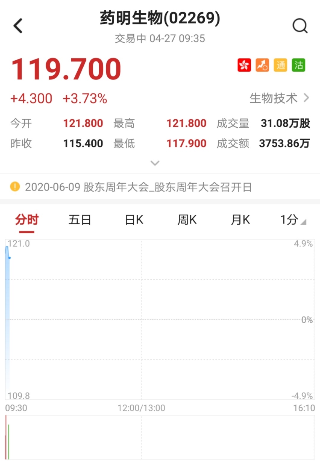 智通财经APP获悉,药明生物(02269)开盘跳空高开逾5%,截至9时34分,涨3.7%,报价119.7港元,成交额3753.86万。