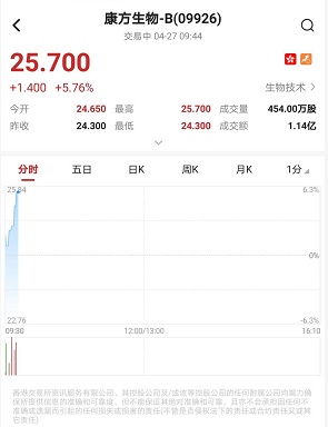 智通财经APP获悉,康方生物-B(09926)上市次日,早盘延续涨势,高见25.95港元刷新上市新高,每股发售价16.18港元。截至9时44分,涨5.76%,报价25.7港元,成交额1.14亿。