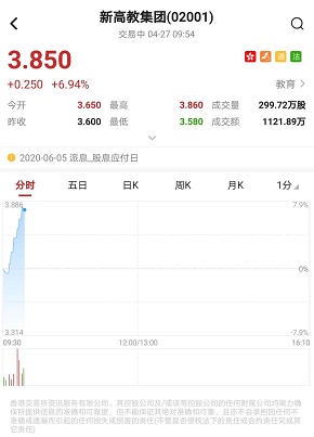 据联交所最新权益披露资料显示,2020年4月22日,新高教集团获董事会主席兼执行董事李孝轩在场内以每股均价3.4644港元增持105万股,涉资约363.76万港元。增持后,李孝轩最新持股数目约为7.9754亿股,持股比例由51.68%升至51.75%。