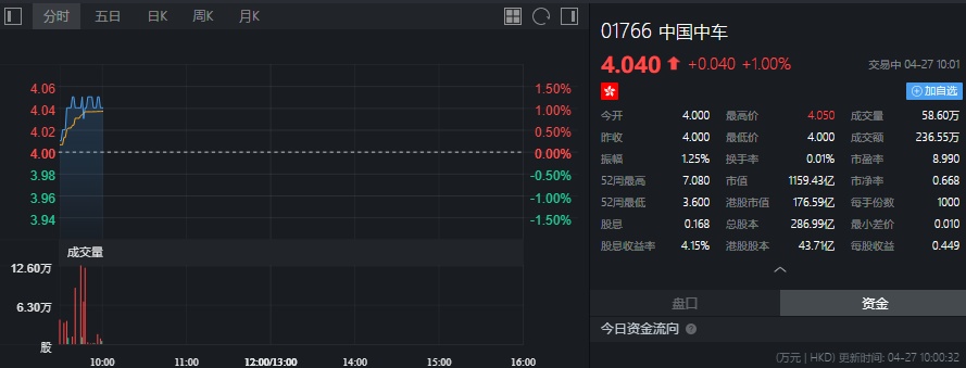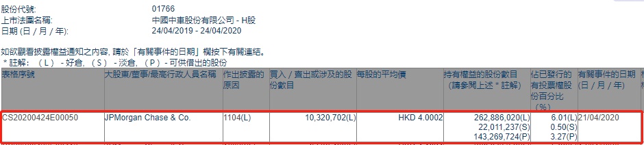 智通财经APP获悉,联交所最新资料显示,4月21日,摩根大通增持中国中车(01766)1032.0702万股,每股作价4.0002港元,总金额约为4128.49万港元。增持后最新持股数目约为2.63亿股,最新持股比例为6.01%。