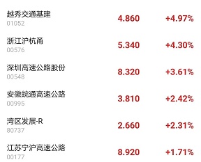 截至10时41分,越秀交通基建涨%,报价4.86港元,浙江沪杭甬(00576)涨4.3%,深高速(00548)涨3.61%,安徽皖通高速公路(00995)涨2.42%。
