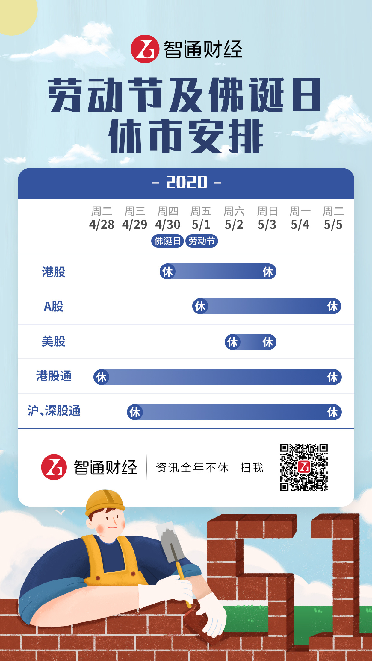 智通财经APP获悉,2020年4月30日(周四)至5月1日(周五)为香港佛诞日及劳动节假期,港股休市,5月4日(下周一)恢复正常交易。