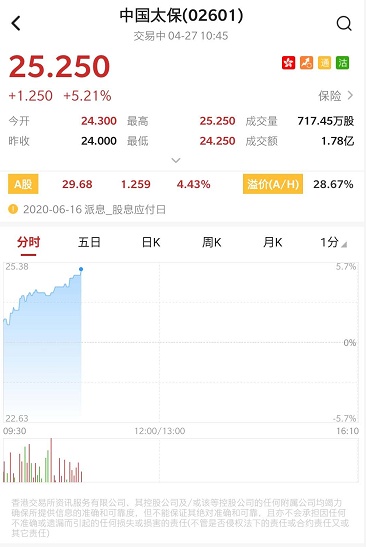 智通财经PP获悉,中国太保(02601)发布公告,截至2020年1-3月份止3个月,该公司实现营业收入约人民币1382.11亿元,同比去年增加3.8%,归属母公司股东净利润83.88亿元,同比去年增加53.1%。截至发稿,中国太保涨5.21%,报25.25港元,成交额1.78亿港元。