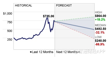 股价方面,综合30位分析师对未来12个月的目标价来看,特斯拉的股价预估中值为492.5美元,其中最高为864美元,最低为240美元,该预估中值较上一次的725.06美元下滑约32.07%。