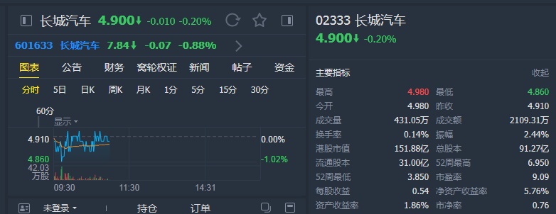 该行下调长汽今明两年盈利预测分别7%及2%,以反映首季业绩,目标价由6.4港元降至6.2港元,维持“买入”评级,相信其每辆车的净利润改善将由改善利润率和成本控制来实现。