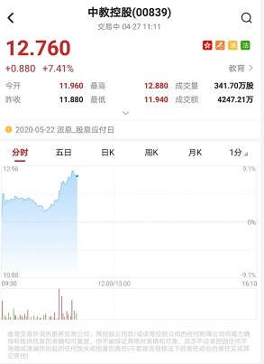 智通财经APP获悉,中教控股(00839)中期业绩超预期,获多家机构唱好,该股盘中延续涨势,截至11时11分,涨7.41%,报价12.76港元,成交额4247.21万。