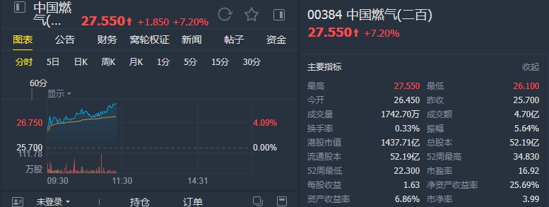 该行表示,维持中国燃气盈利预测与目标价30港元,对应2020财年市盈率14.5倍,维持“跑赢行业”评级。