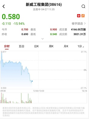 智通财经APP获悉,次新股新威工程集团(08616)高开低走,盘中倒跌逾20%,振幅达52.17%,截至11时35分,跌15.94%,报价0.58港元,成交额3021.31万。